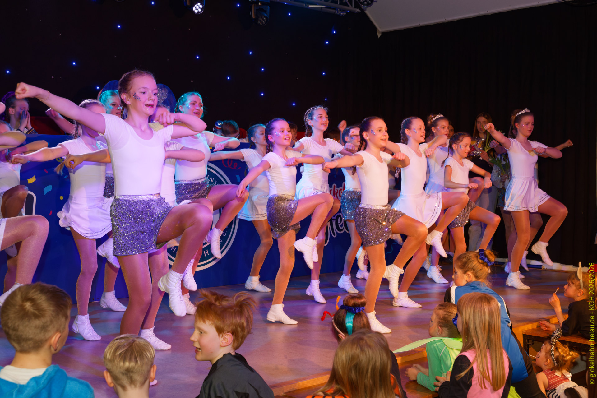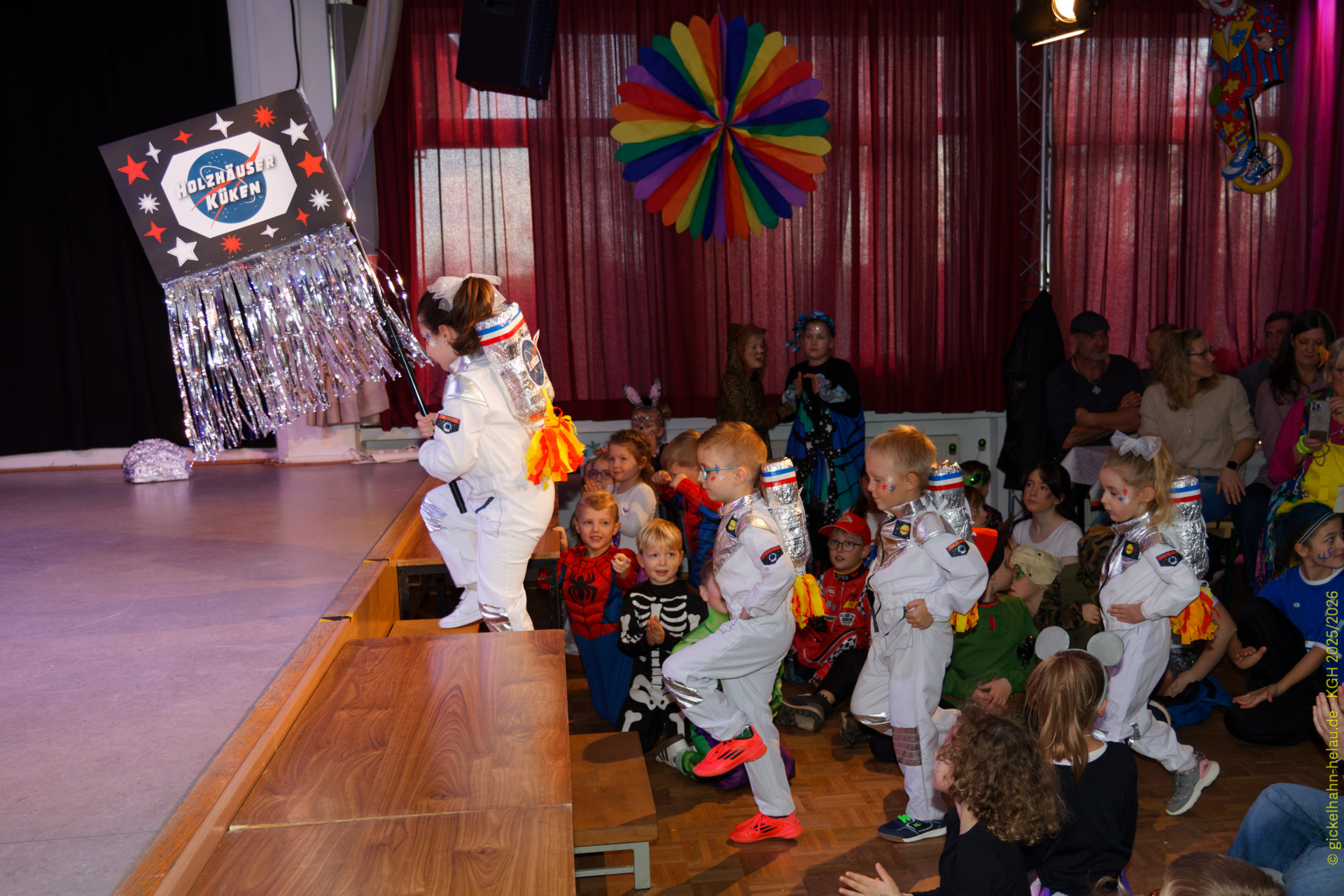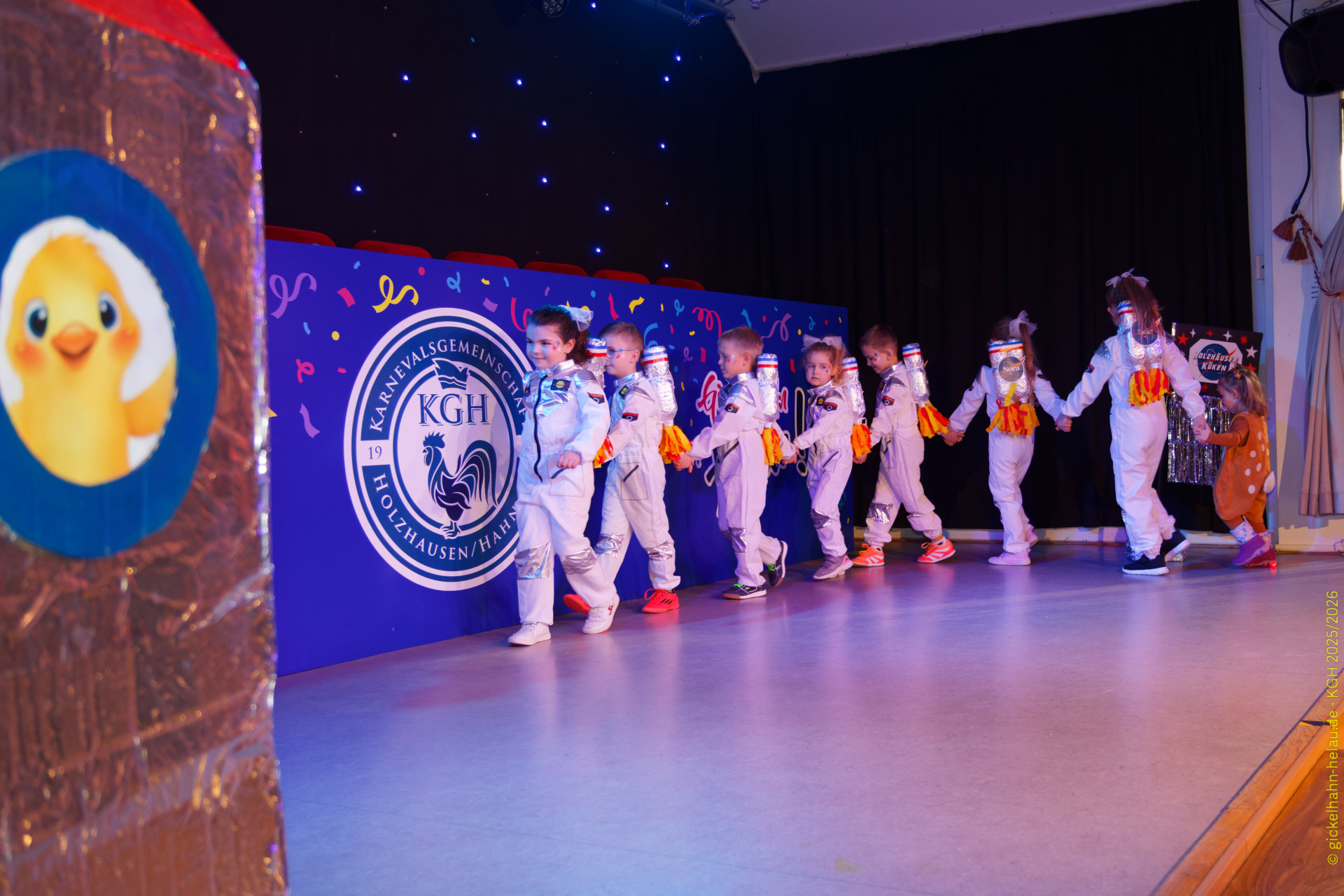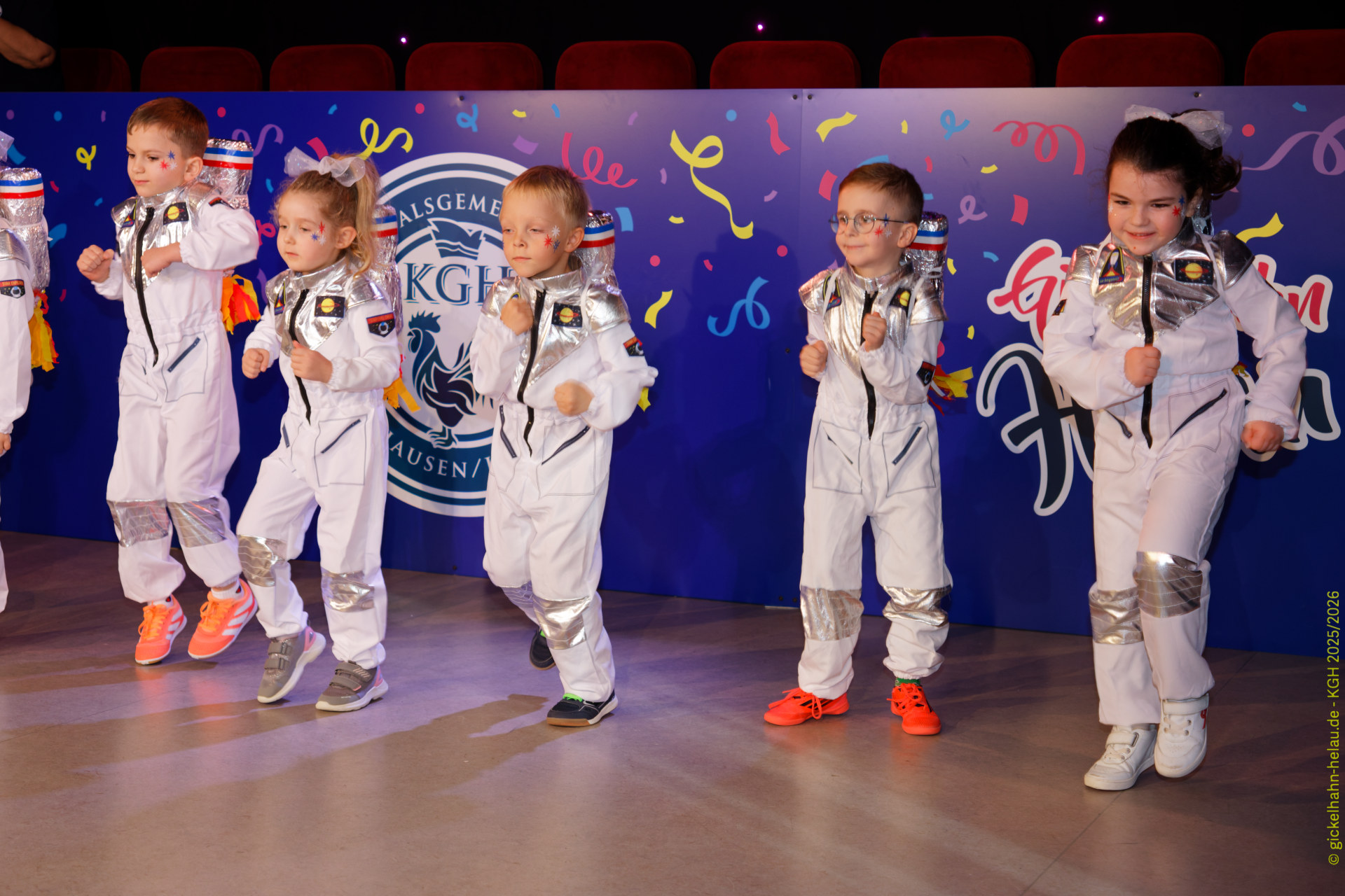 Doch es geht noch kleiner: die Holzhäuser Küken mit ihrem Showtanz „Küken im All – KGH feiert galaktisch“. Mit dem Start der Rakete ging es auf die Bühne und dort zeigten die Küken, was im All alles geht. Trainiert wurde die kleinen Astronauten von Barbara und Stella Pawletta sowie Dajana Dulemba-Petrich.