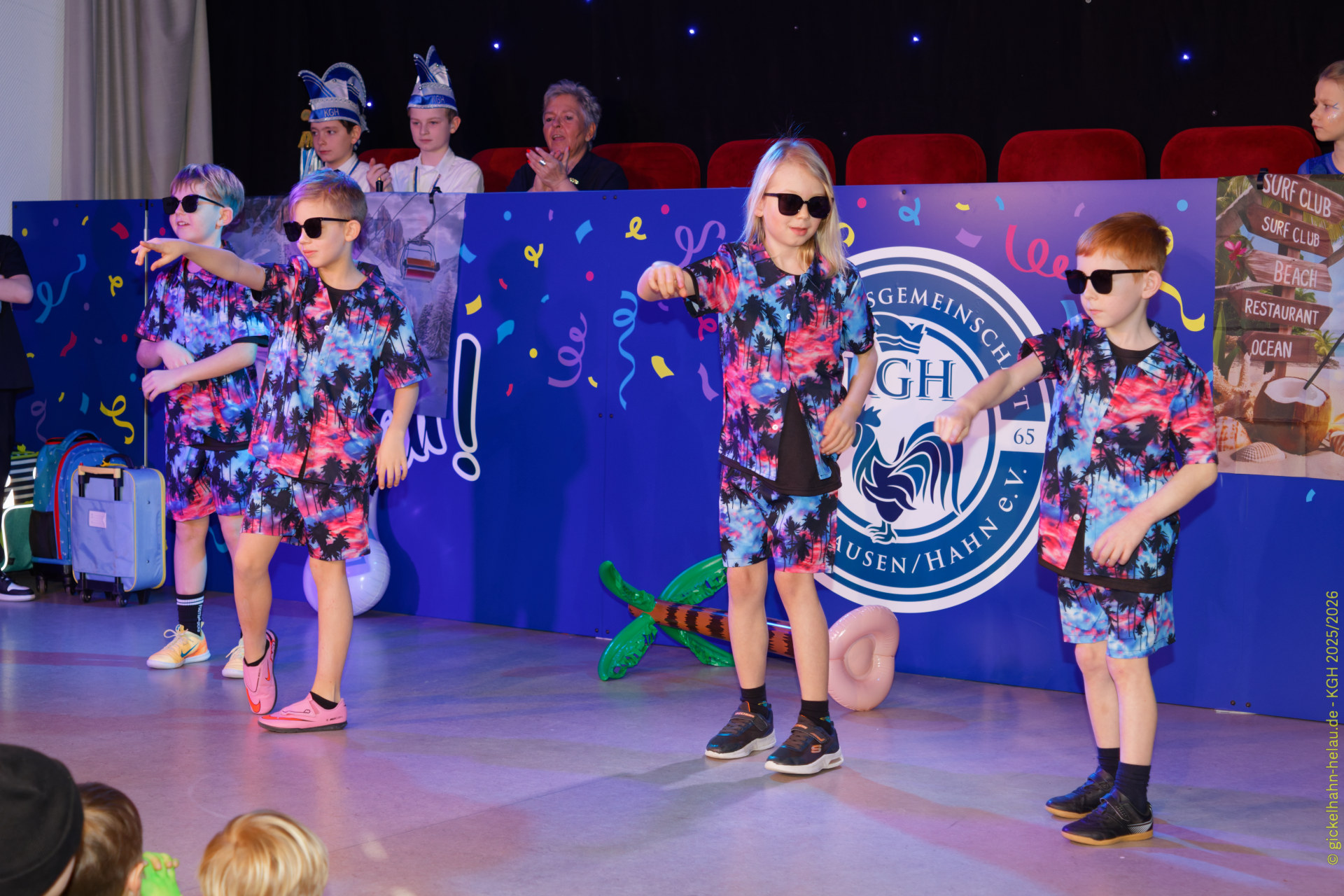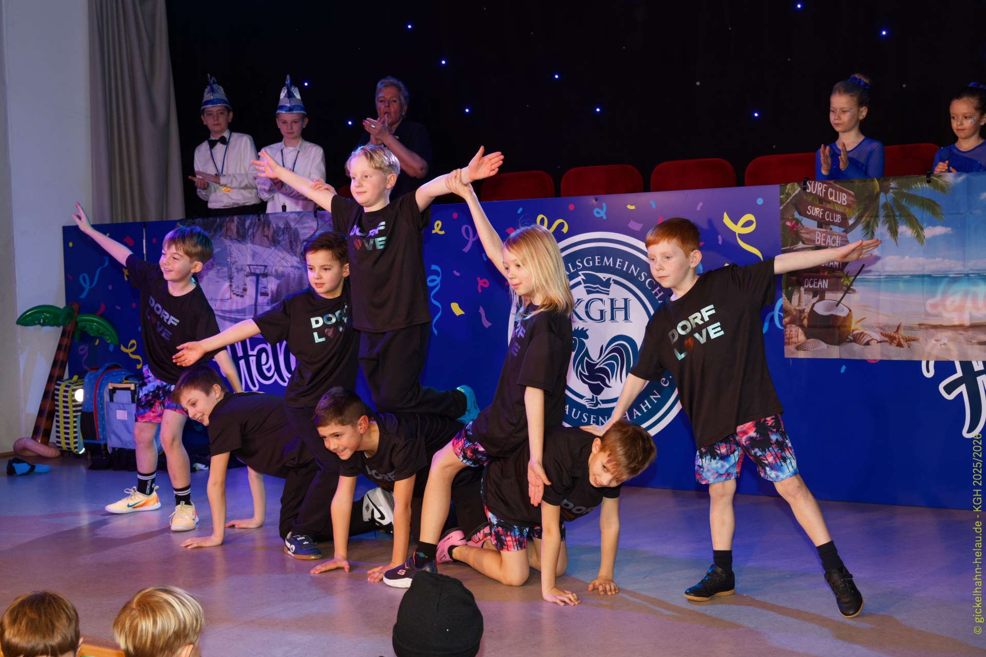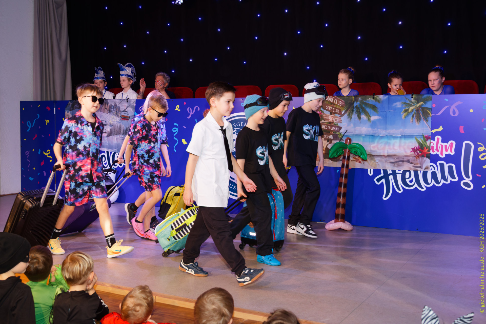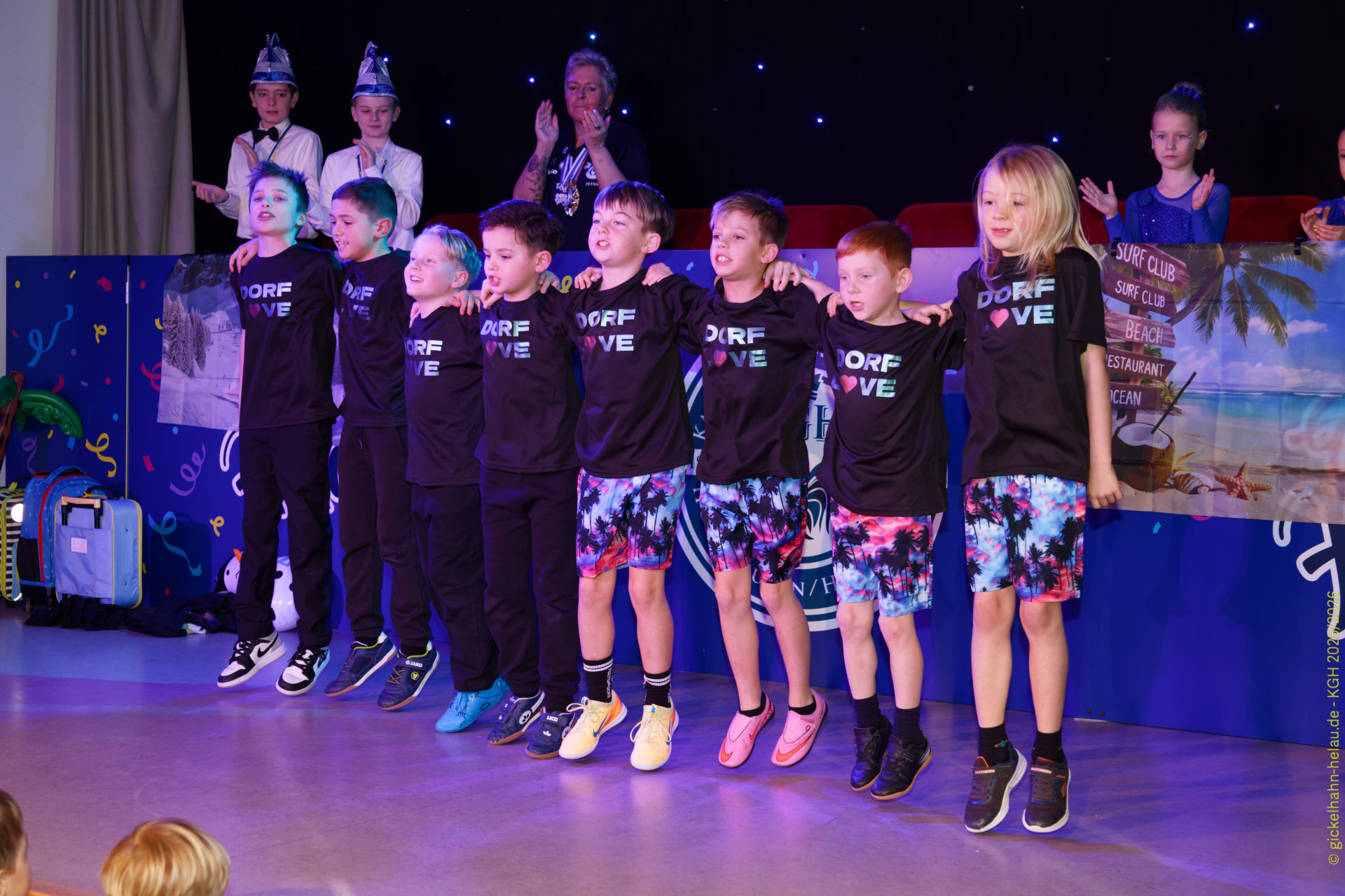 Dann kamen „The Rockets“ mit ihrem Showtanz: „Ab in den Urlaub“. Gewissenhaft wurde überlegt: Malle oder Skiurlaub. Das Ergebnis – wie konnte es anders sein – zu Hause am Hahn ist es doch am schönsten. Die Trainerinnen Julia Nitzbon und Miriam Dülfer hatten die Jungs ganz gut im Griff.