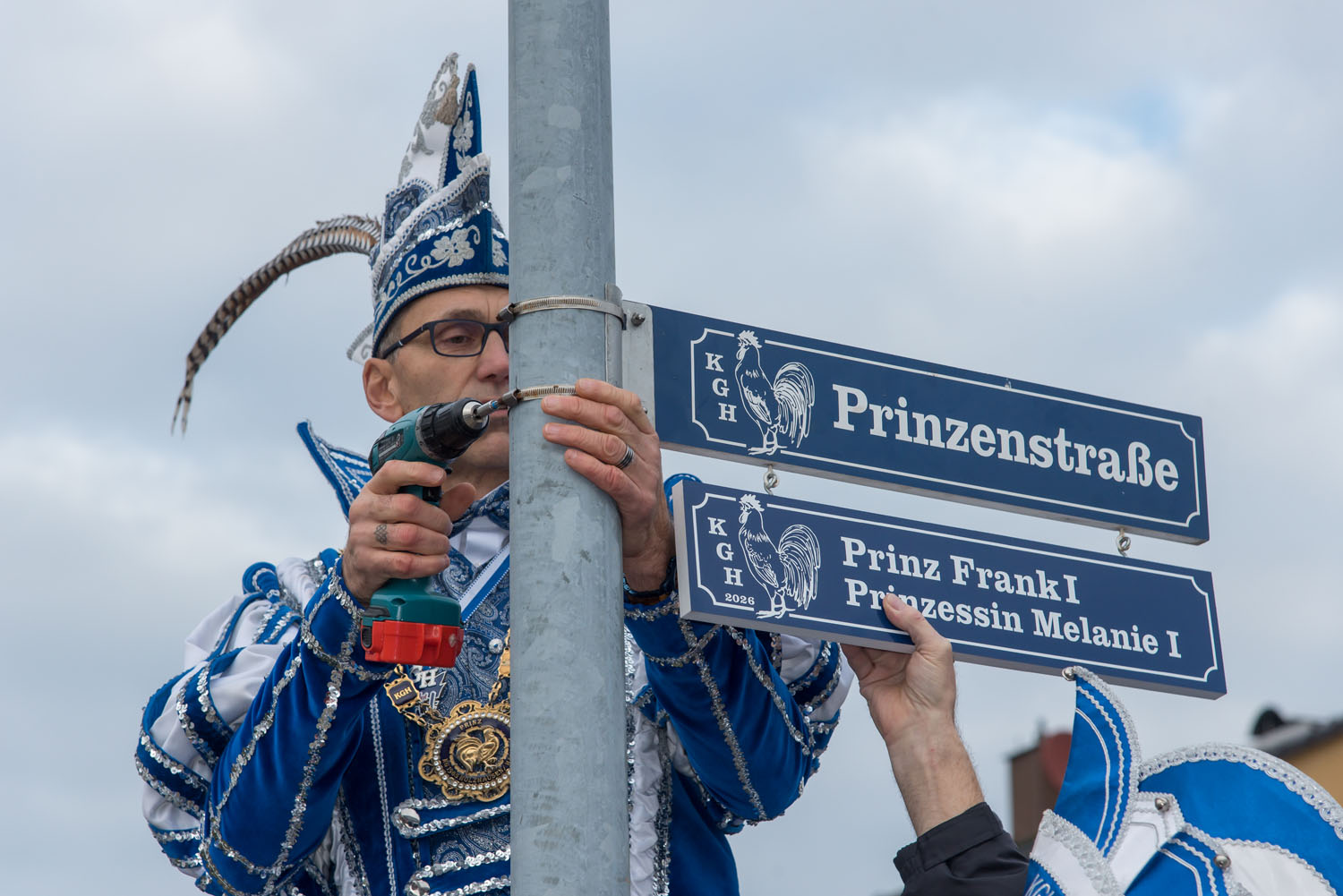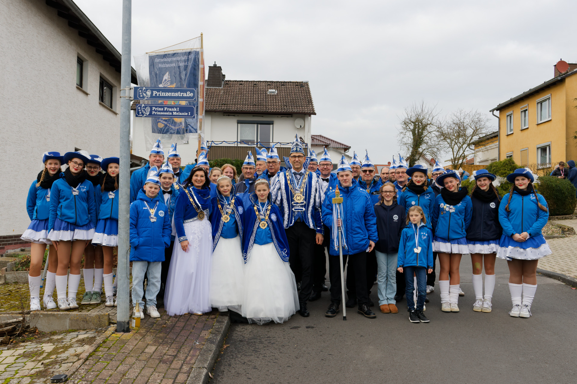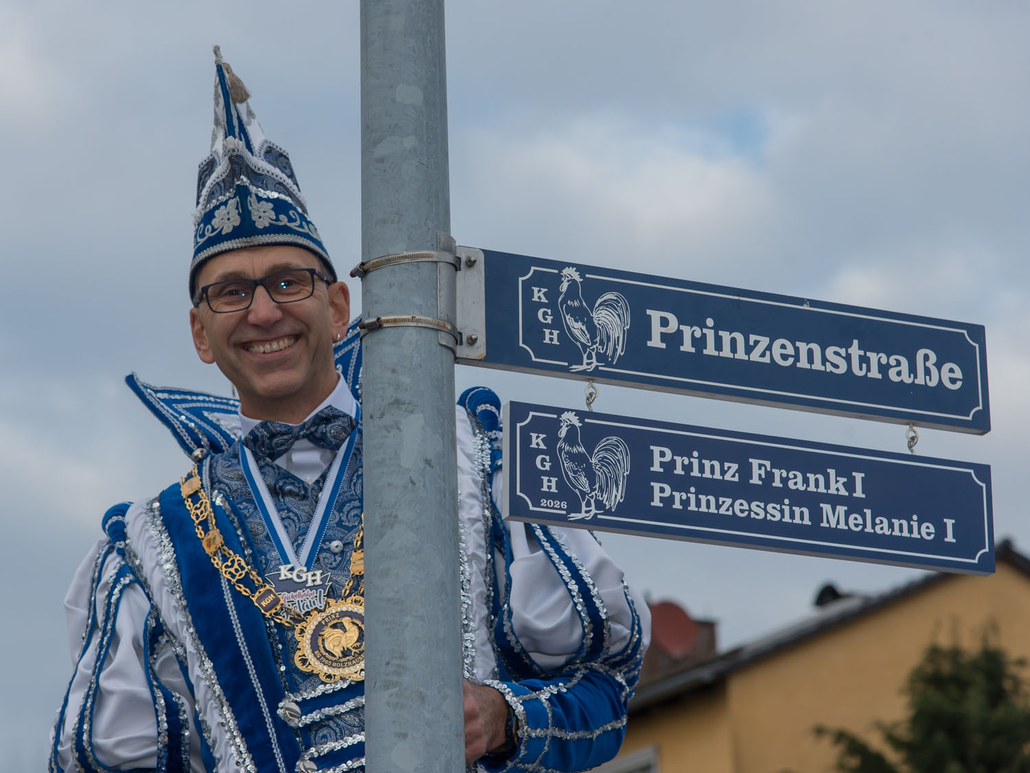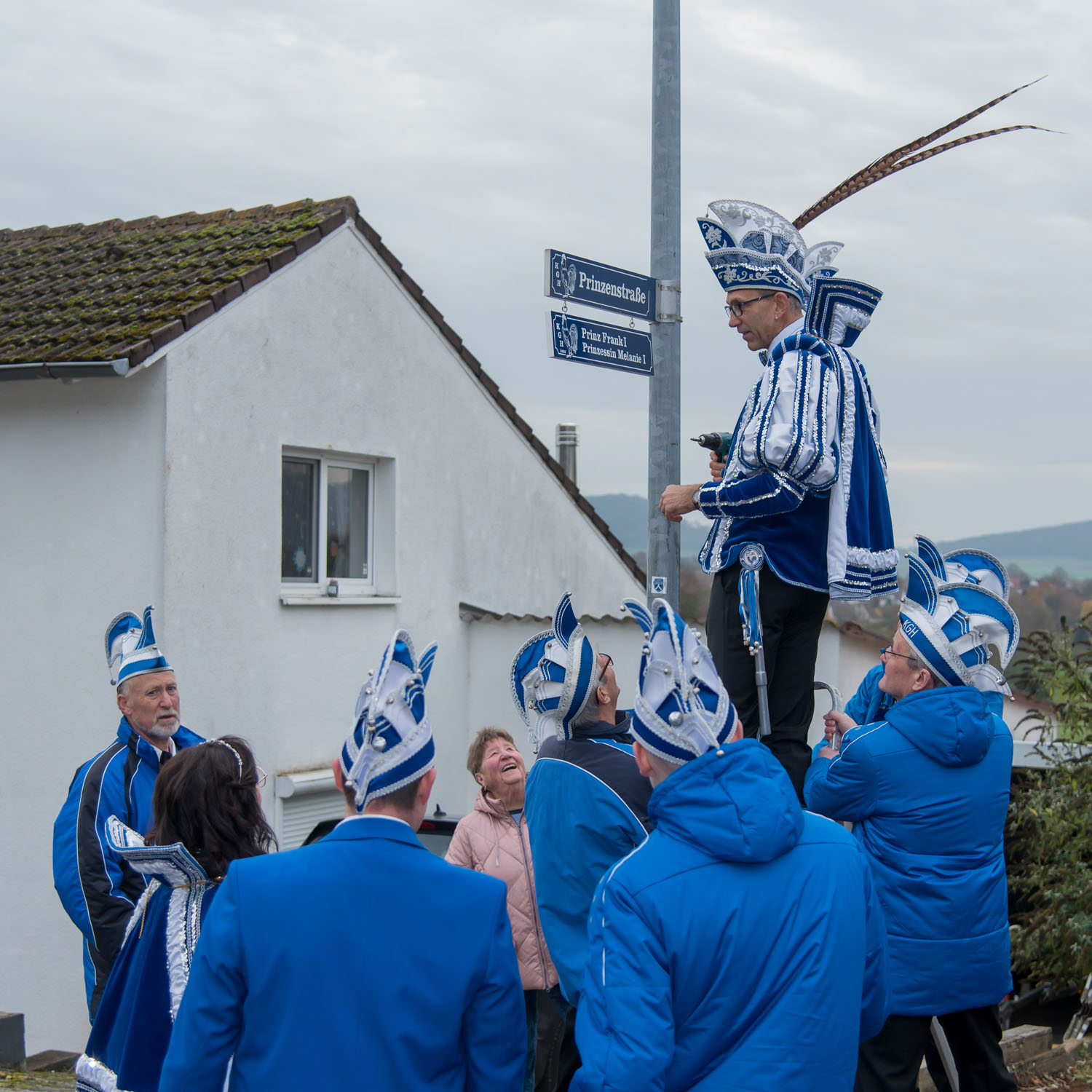Auf machten sich die Elferräte, Kinderprinzessinnenpaar die Niedlichkeiten Holly I. aus dem Hause Ranft und Mathilda I. aus dem Hause Amely, Prinzengarde und ganz viele Mitglieder und Besucher am 15.11.2025 zur Prinzenstraßeneinweihung nach Grifte.Bei unserem Prinzenpaar seiner Herrlichkeit Prinz Frank I. – KGH-Vorstands- und Senatorenknödel, Feuerwehrheld für Groß und Klein und seiner Lieblichkeit Prinzessin Melanie I. – KGH-Perle und Kaiser-Treue mit Herz und Hand vom Grifter Hang und Forsters angekommen, wurden wir auf dem Balkon des Hauses fündig und baten das Prinzenpaar zu uns herunter.